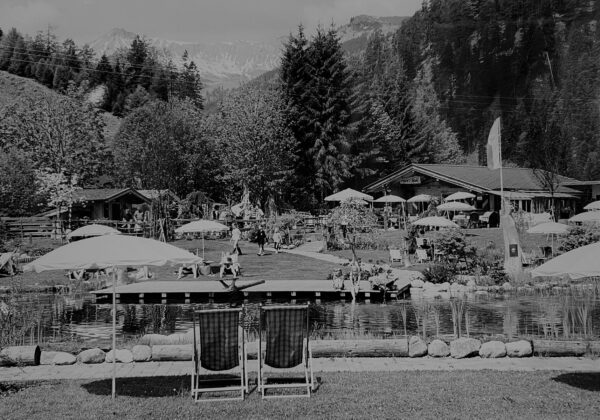 Übrigens habt Ihr es schon bemerkt? Unser kleiner Achensee, den wir gleich zu Beginn schon angelegt haben, ist formgetreu angelehnt an den großen Achensee. Der Name „Kleiner Achensee“ ist daher redlich verdient! Da saßen wir also, am Ufer unseres eigenen glitzernden Achensees und blickten auf die noch kleine, traditionelle Blockhütte – schon damals war sie unsere Seealm – vor uns, die wir von Beginn an sehr mochten und überlegten, wie wir sie erhalten und sinnvoll nutzen könnten. Schnell war uns klar, nicht nur ein Umbau, sondern eine Erweiterung war es, die wir uns wünschten. Trendig und zeitlos sollte die neue Seealm werden. Dass uns das ganz gut gelungen ist, spüren wir jeden Tag aufs Neue, wenn sich die Seealm zum Herzstück im Familienparadies entpuppt. Hier wird gegessen, gebadet, angestoßen, eingekehrt, der Musik gelauscht und gelacht. Die unterirdische Verbindung legten wir etwas später an, um mehr Komfort und Sicherheit zu bieten.
