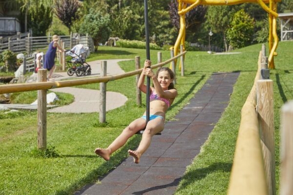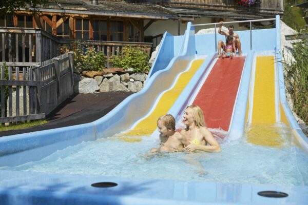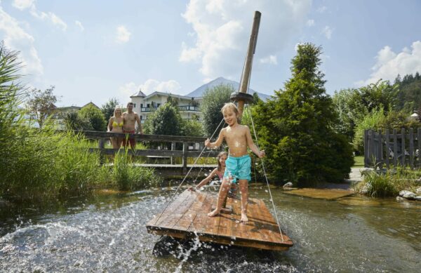 Badespaß und prickelnde Abkühlung bietet unser Naturbadesee, den wir „Kleiner Achensee“ nennen, da er eine detailgetreue Nachbildung des echten Achensees ist – mit Wasserrutsche und großzügiger Liegefläche. Außerdem ein Piratenfloß, das man mit etwas Teamwork spielend von Ufer zu Ufer bringt. Erholung und Spaß – ideal für kleine und große Wasserratten!
