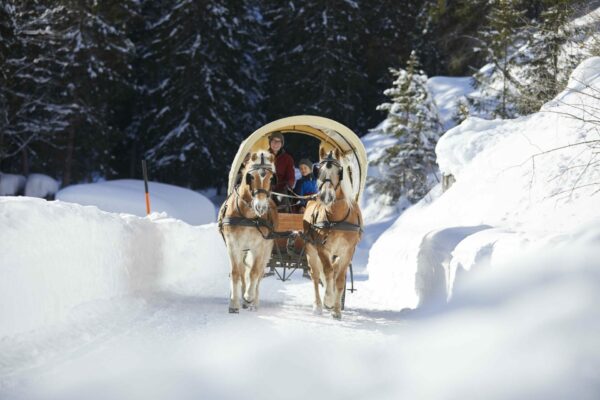 A horse-drawn carriage ride through snowy, enchanting winter landscapes is a special experience and completes your winter holiday in Austria. Whether as a Auszeit for two or with the whole family – a trip through the Karwendel valleys in bright sunshine and glittering snow will not be forgotten in a hurry – promised!